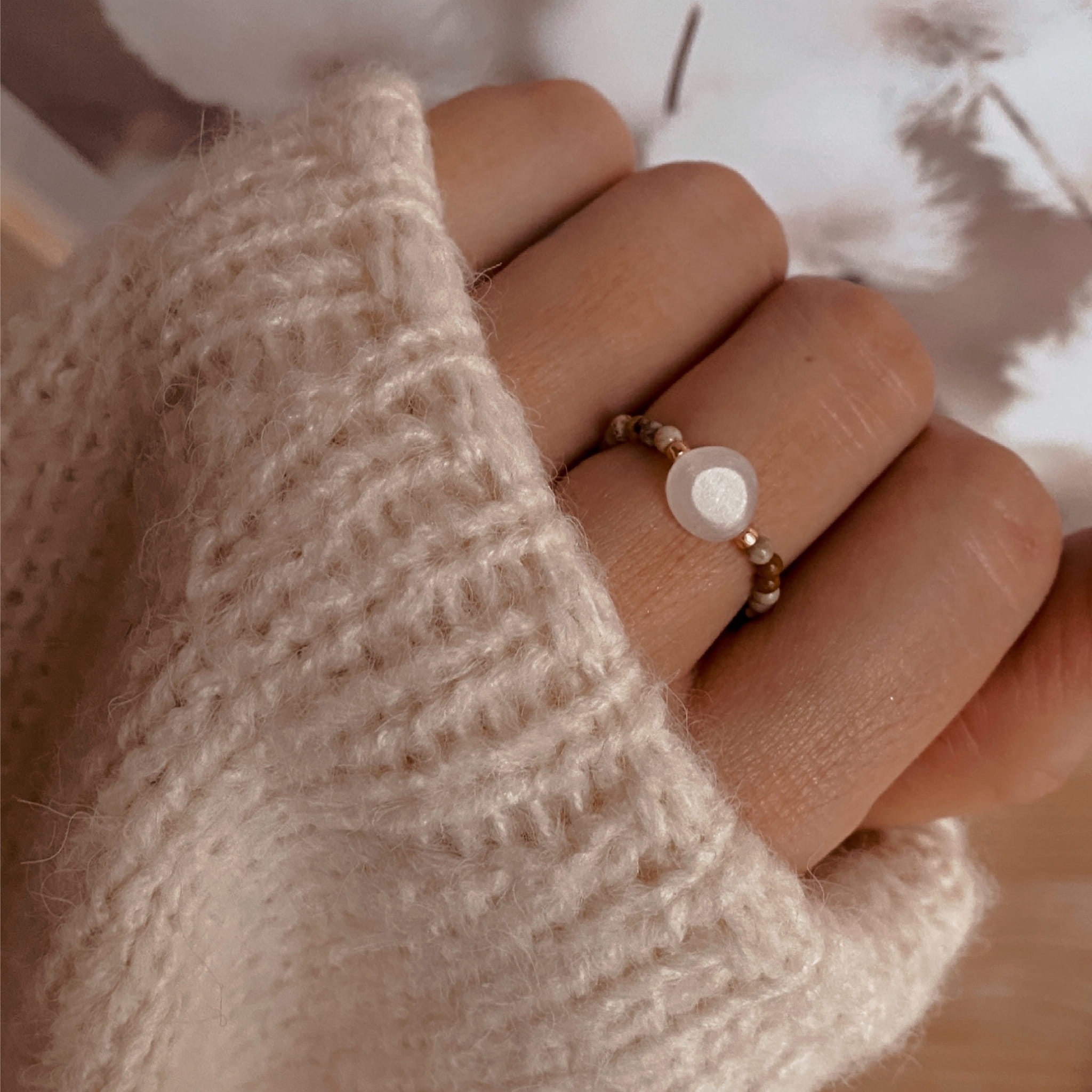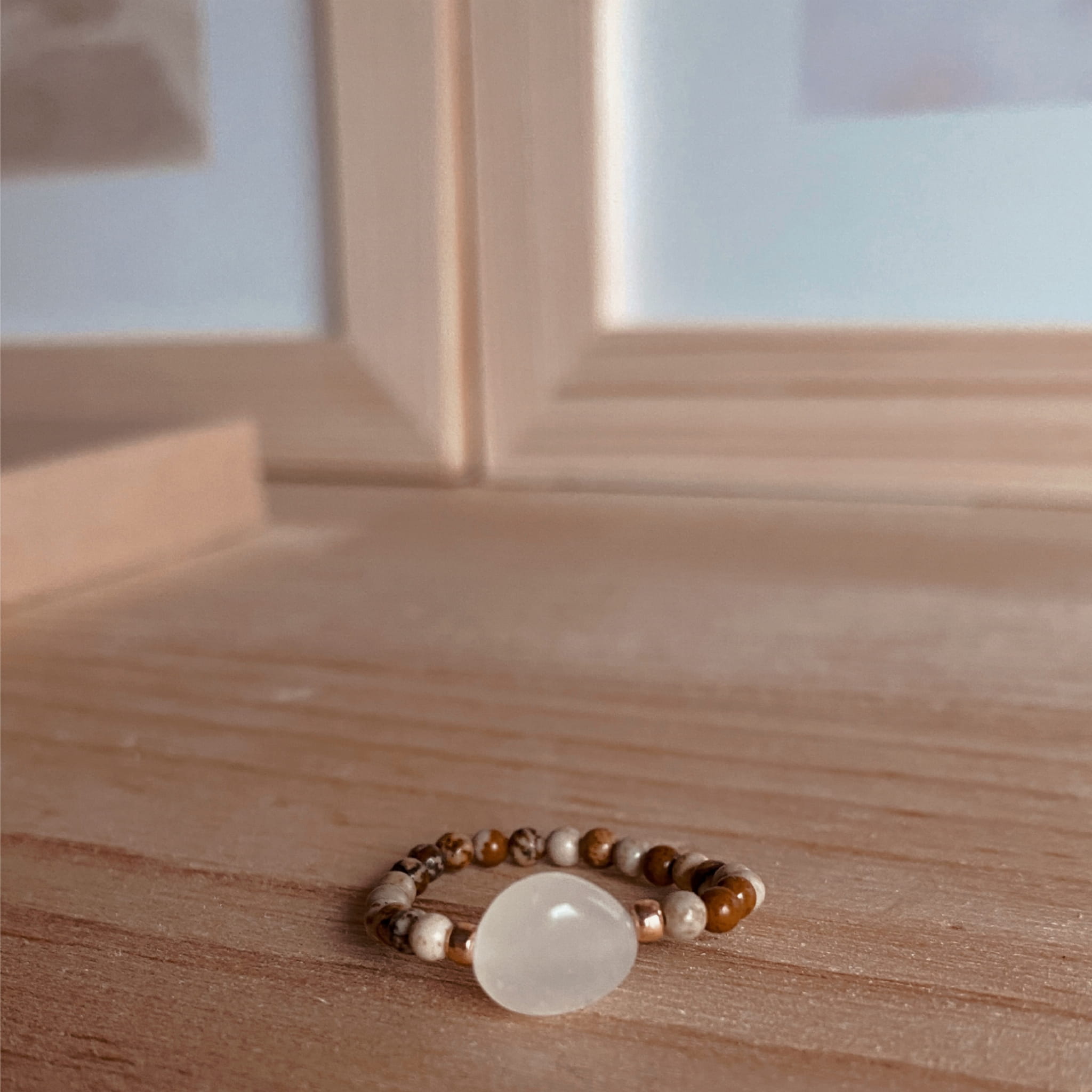 Pierścionek na elastycznej żyłce jubilerskiej w połączeniu z Jaspisem oraz Kamieniem Księżycowym.
