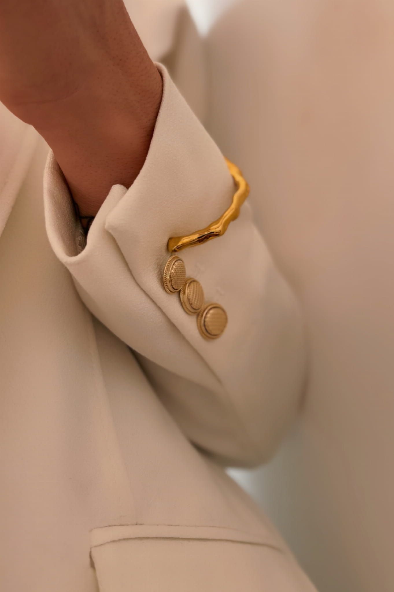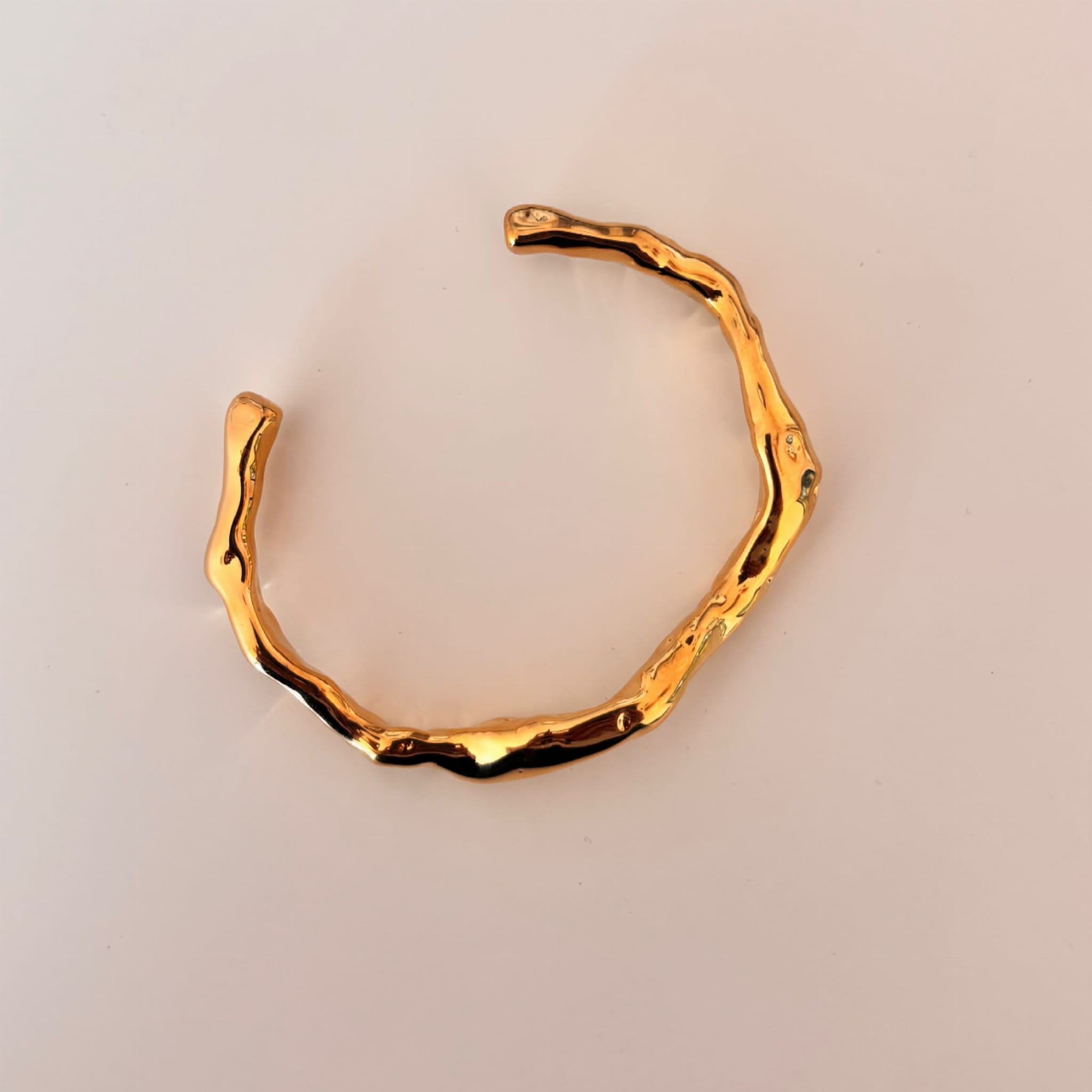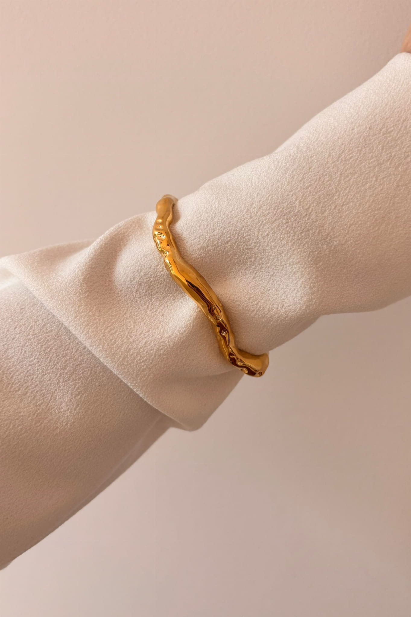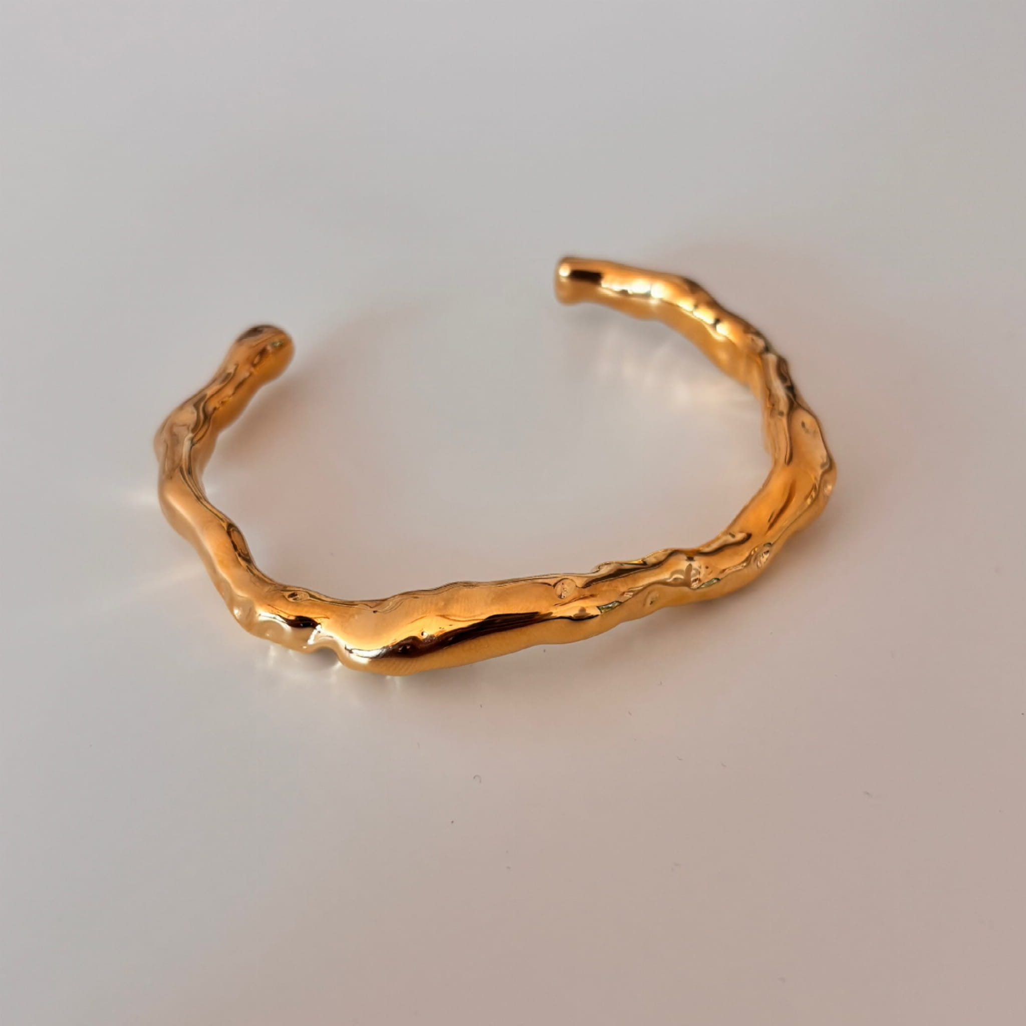 Złota bransoletka o nieregularnym, wyjątkowym wzorze podkreślającym każdą stylizację.