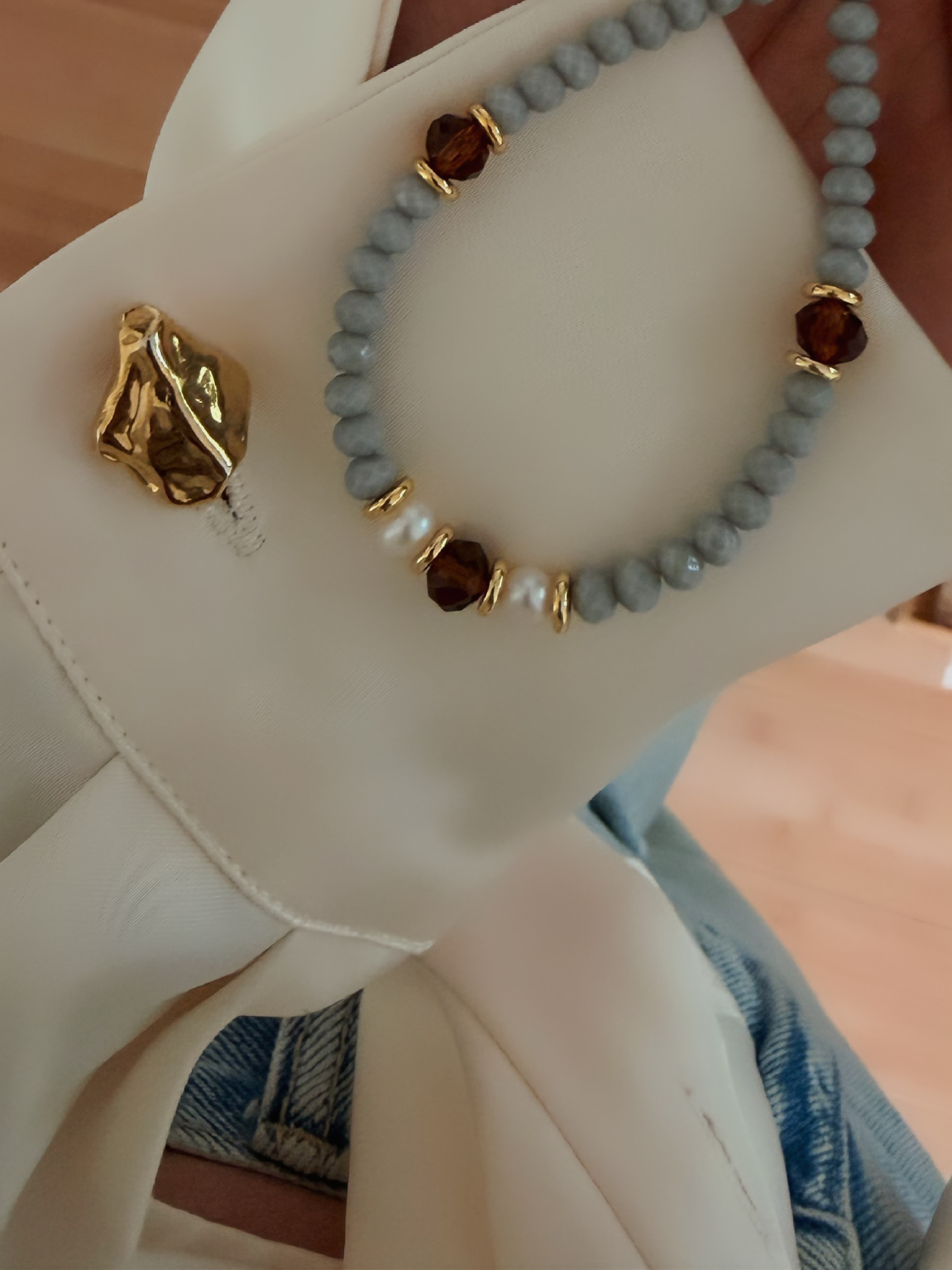 Bazą są szare fasetowane koraliki szklane, przeplatane brązem , złotem i perłą słodkowodną.