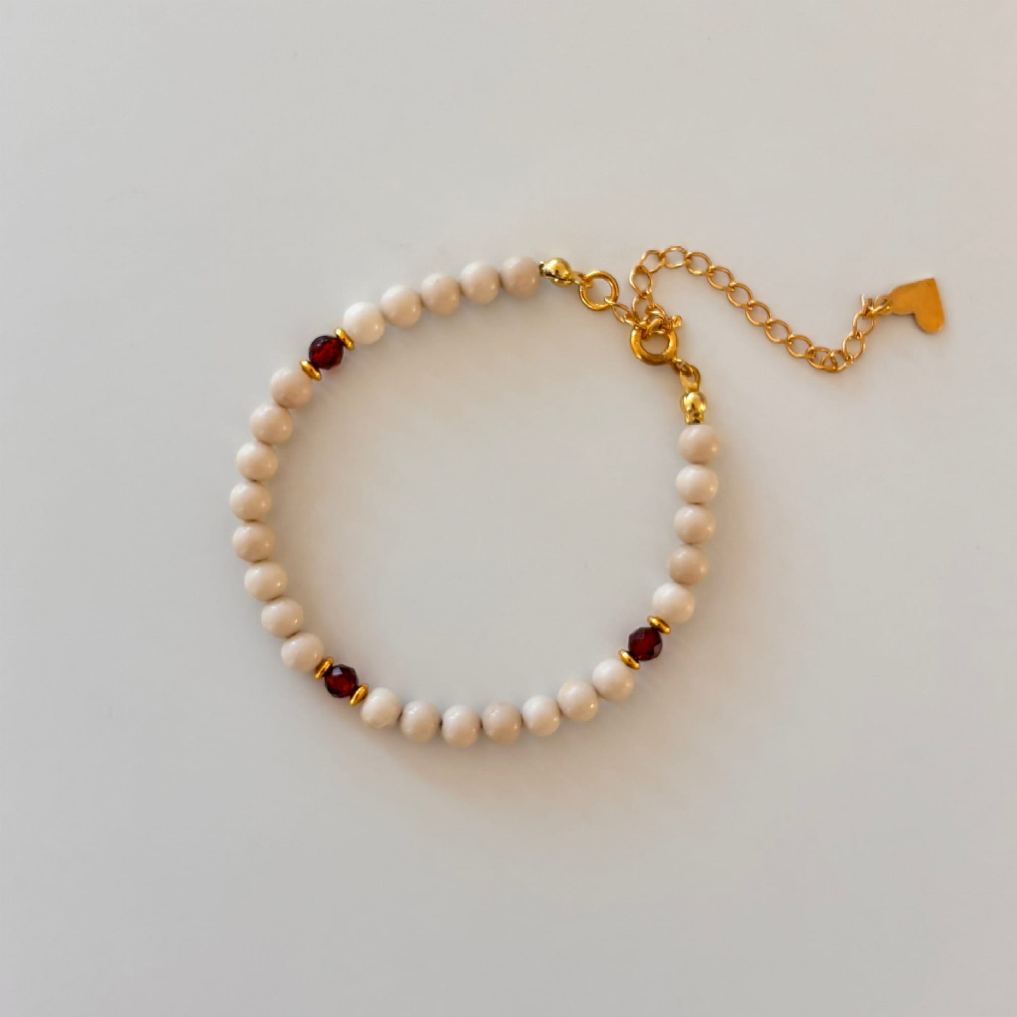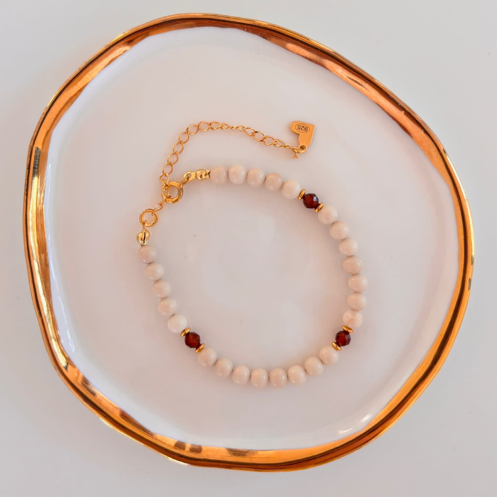 Minimalistyczna bransoletka na bazie z kremowych Jaspisów przeplatana granatami w odcieniach brązu.