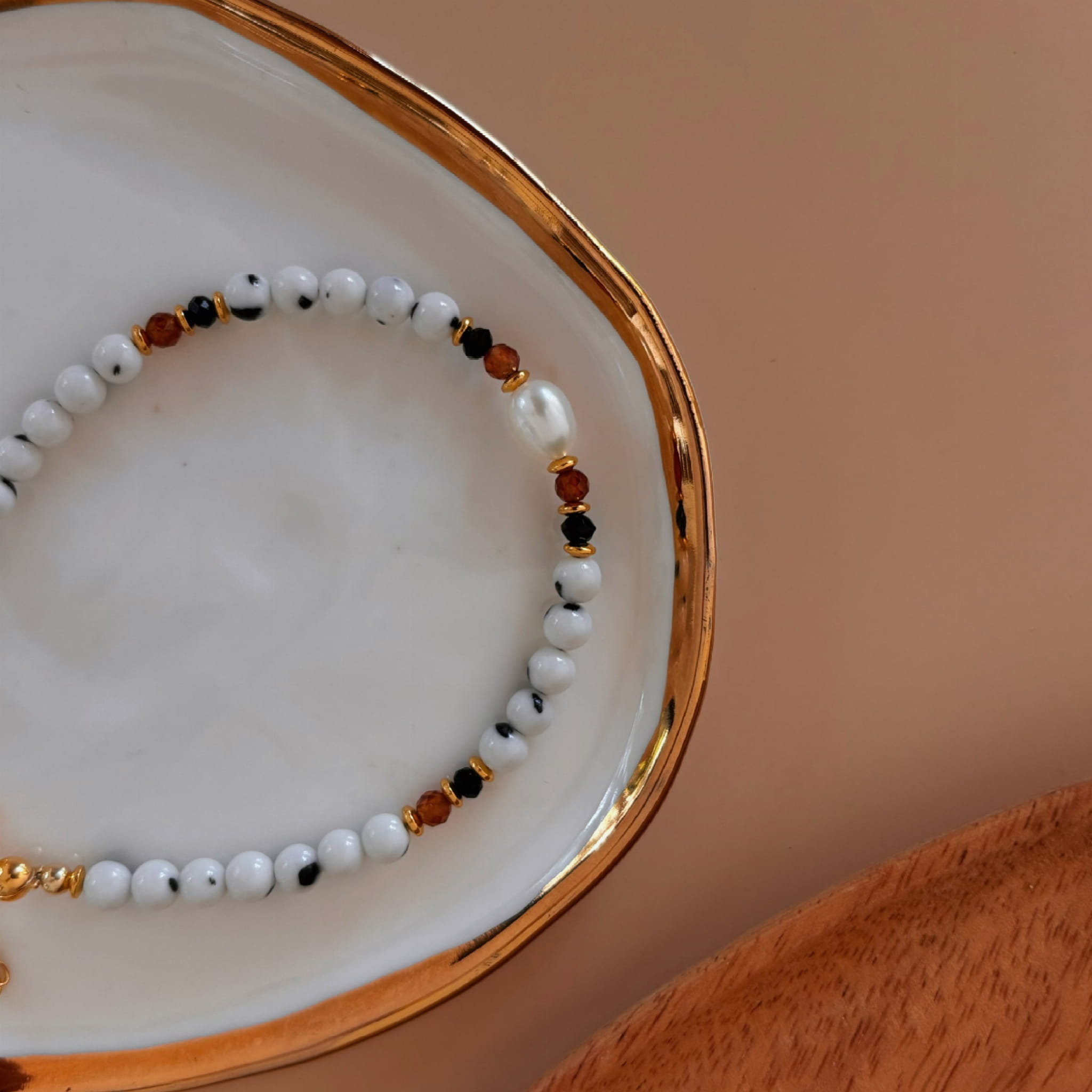 Kamienie przeplata perła w centralnej części oraz pomarańczowy granat , czarny Onyks, które idealnie komponują się z Jaspisem.