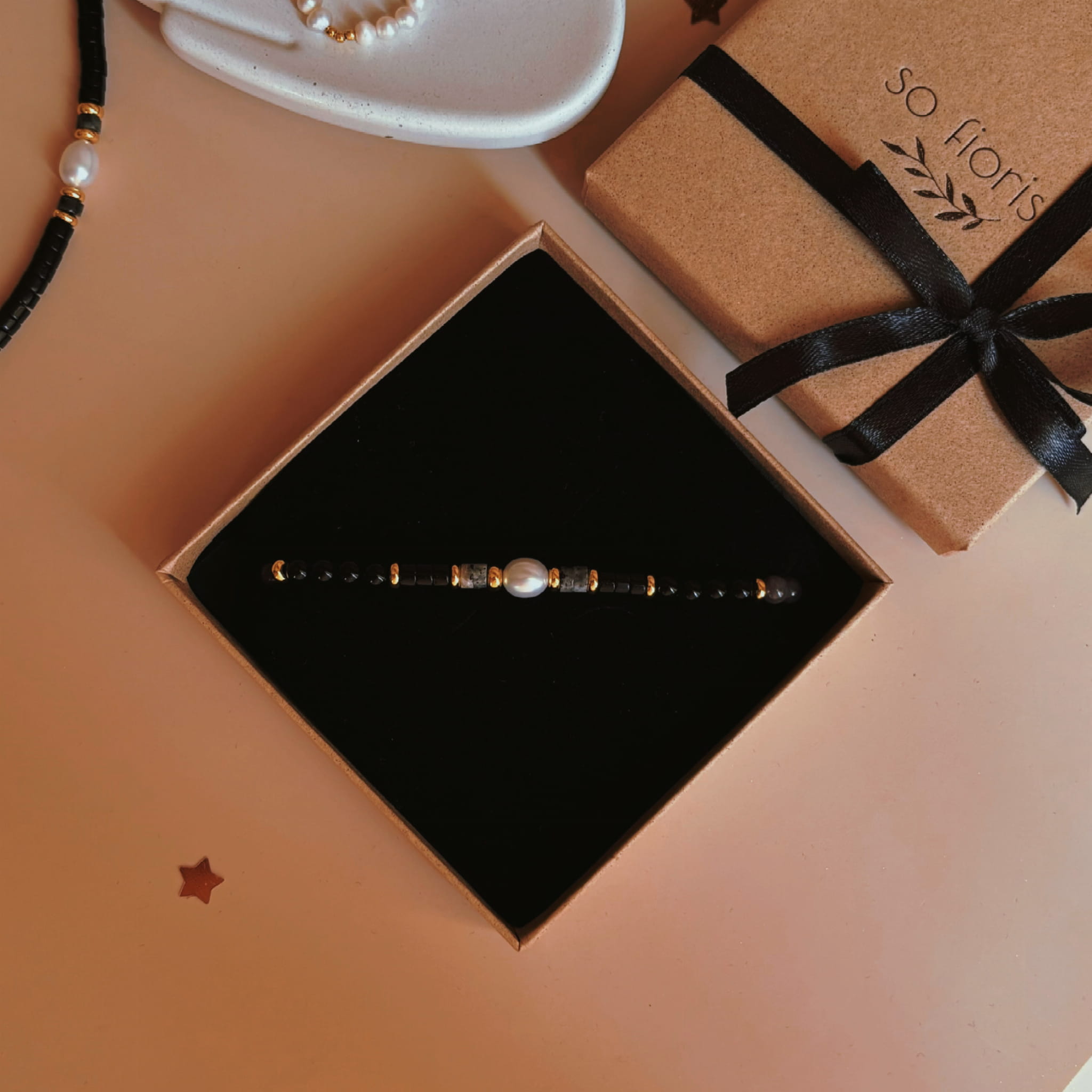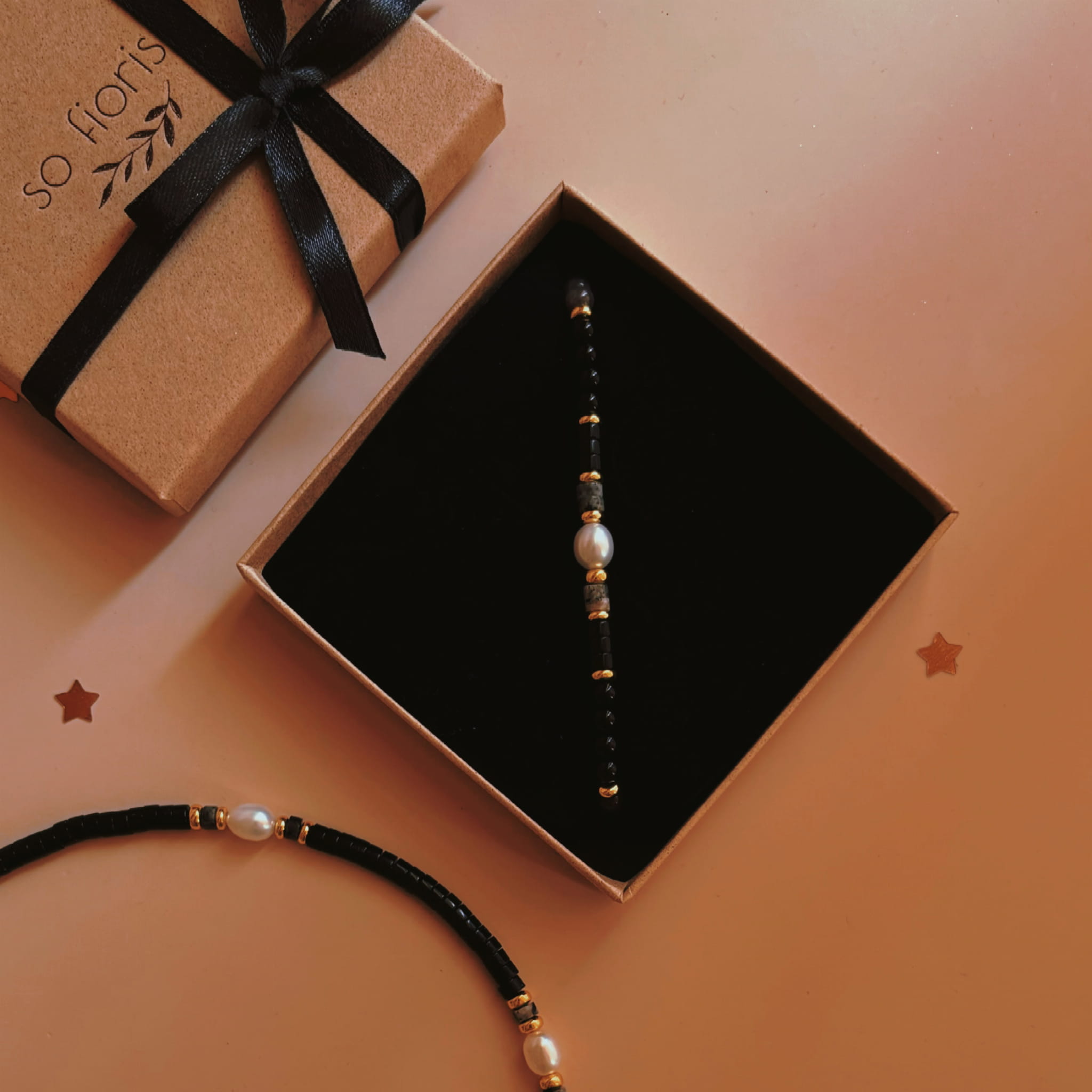 Pomiędzy czarnymi Onyksami znajdują się perły oraz szary Larvikit.