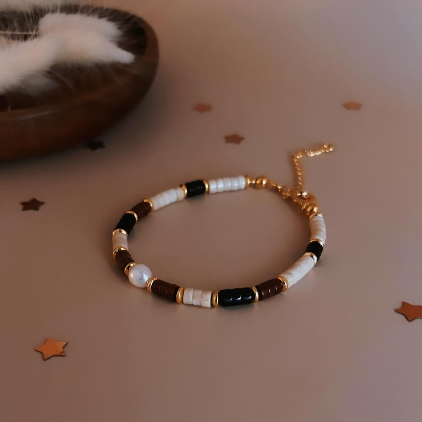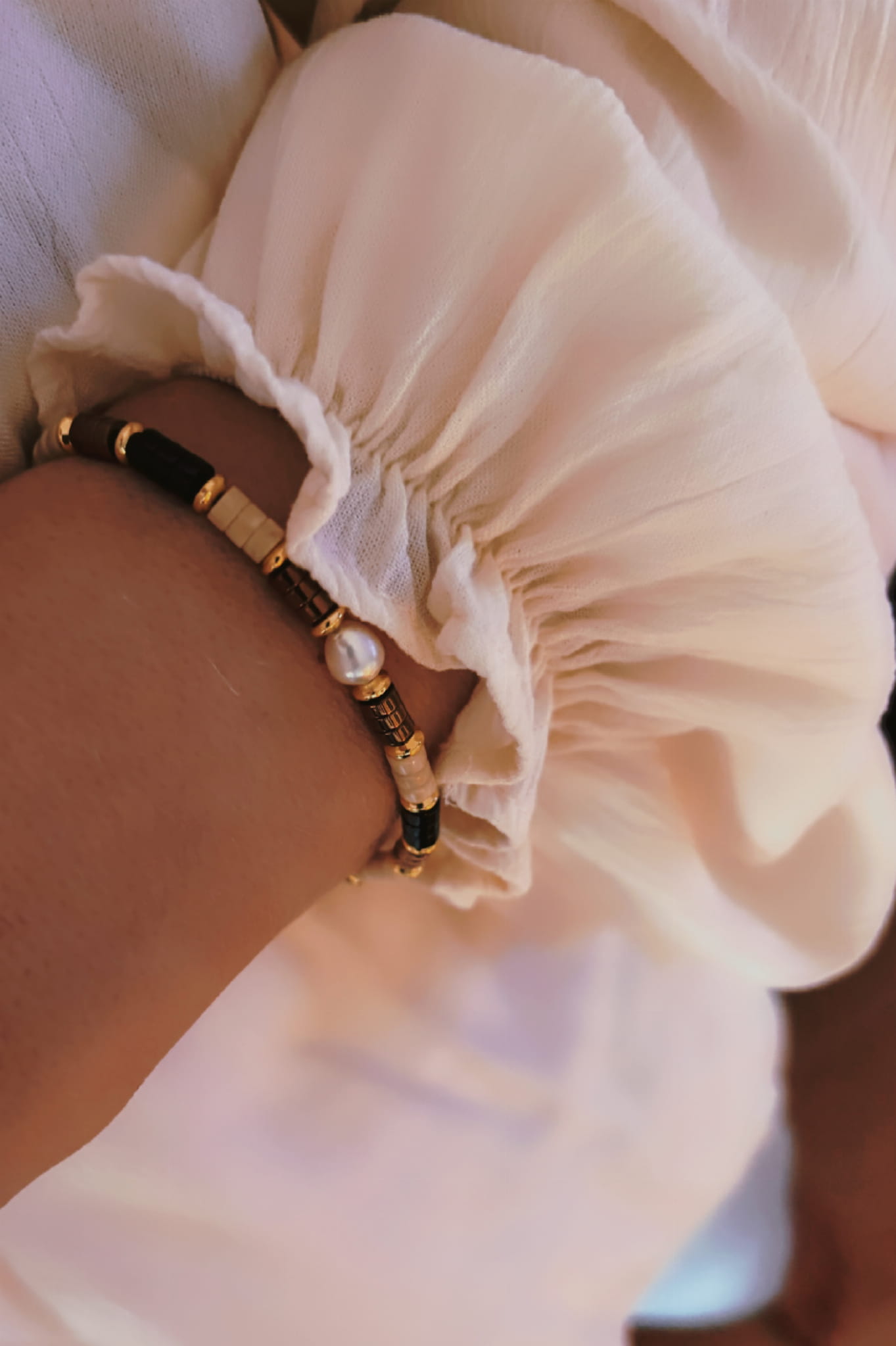 Bransoletka na kremowej bazie z Howlitów przeplatana czarnym Onyksem oraz ciemno brązowym Hematytem.