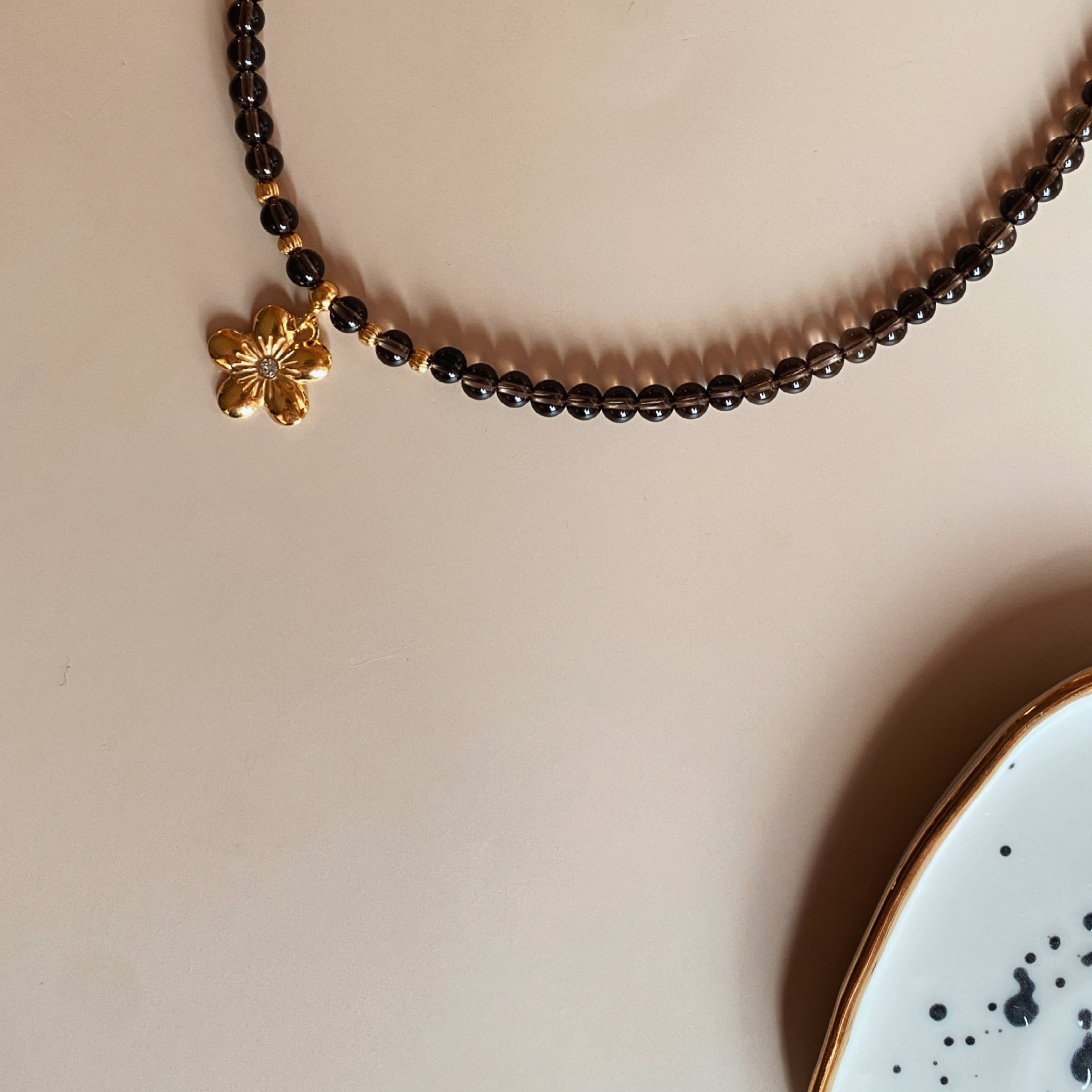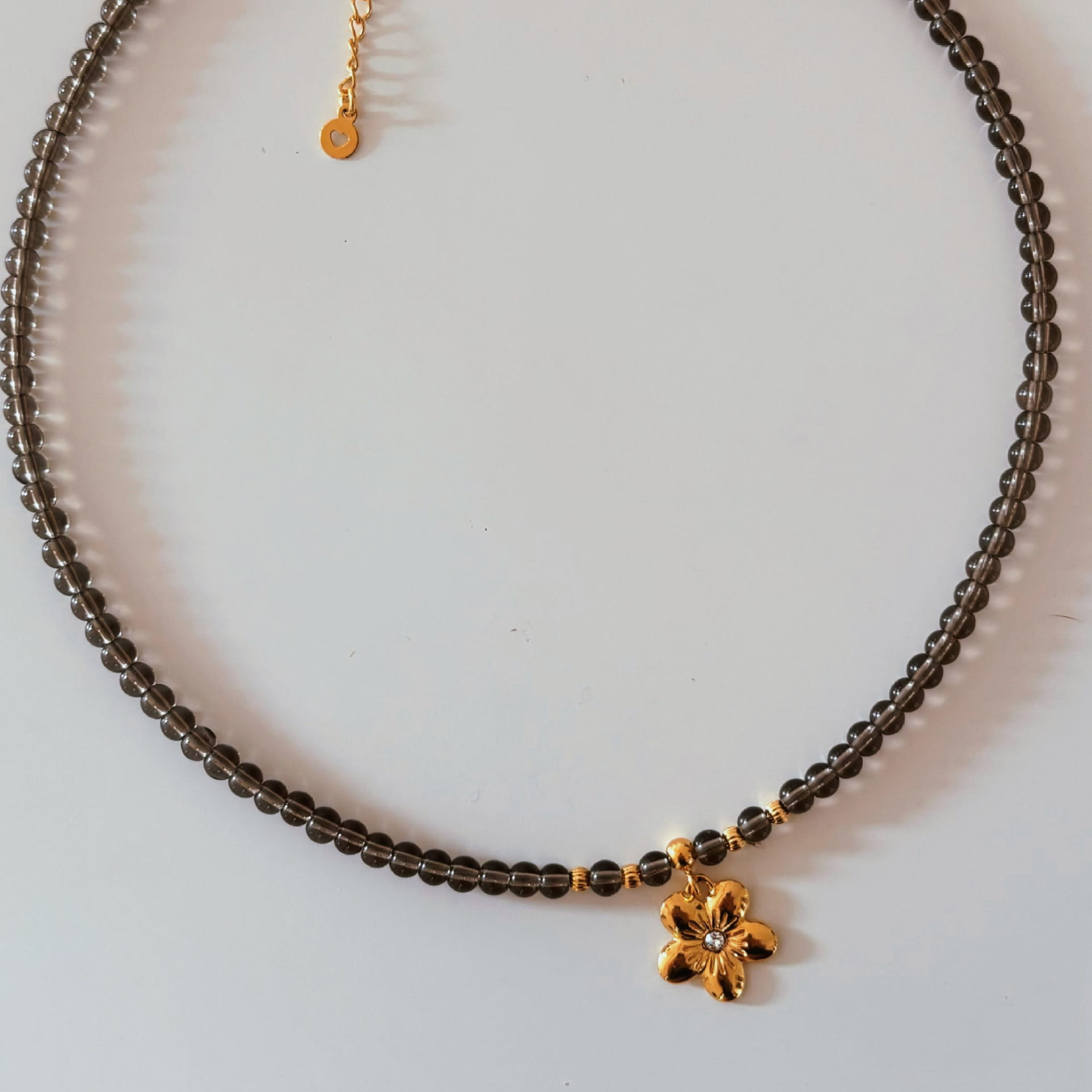 Naszyjnik z kwarcem dymnym w kolorze transparentnego brązu z dodatkiem pozłacanego kwiatuszka.