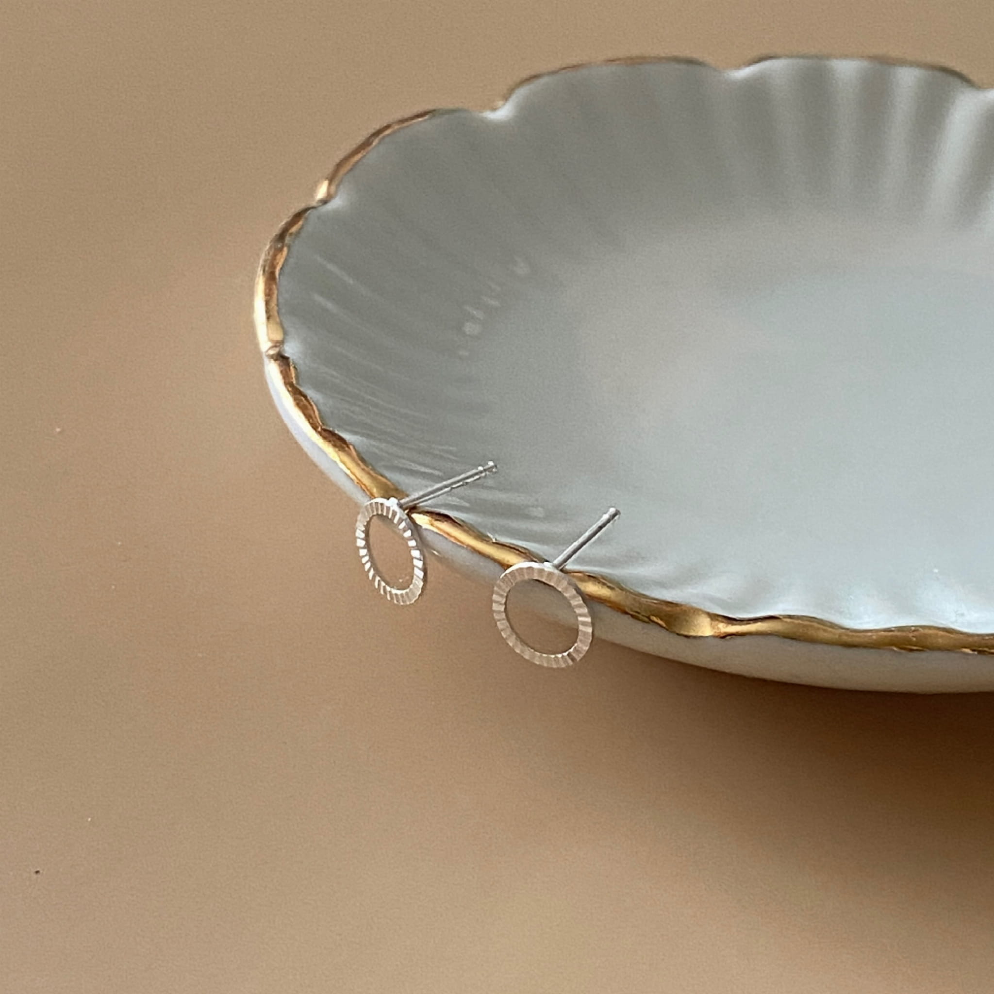 Kolczyki w kształcie kółeczek o nieregularnej powierzchni.