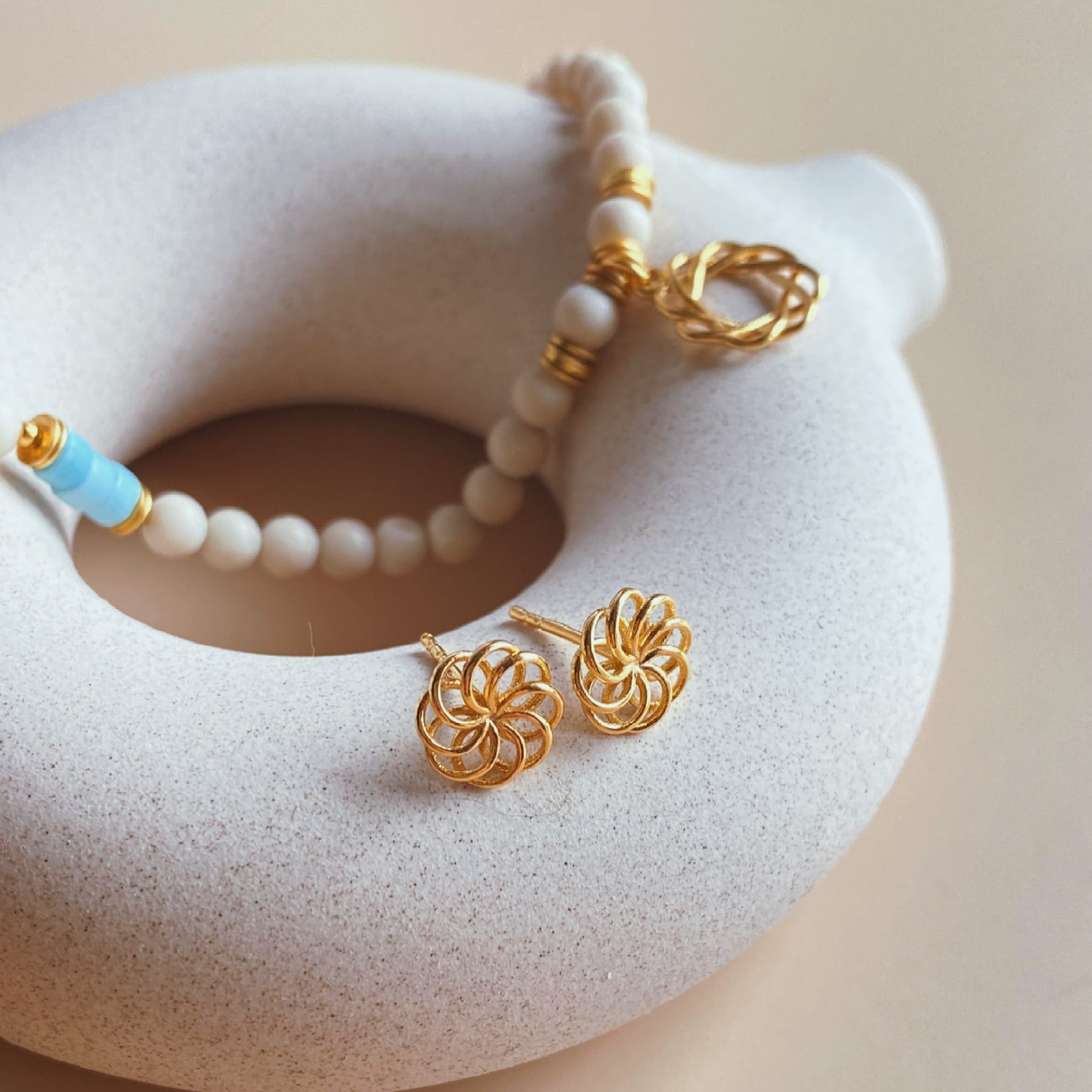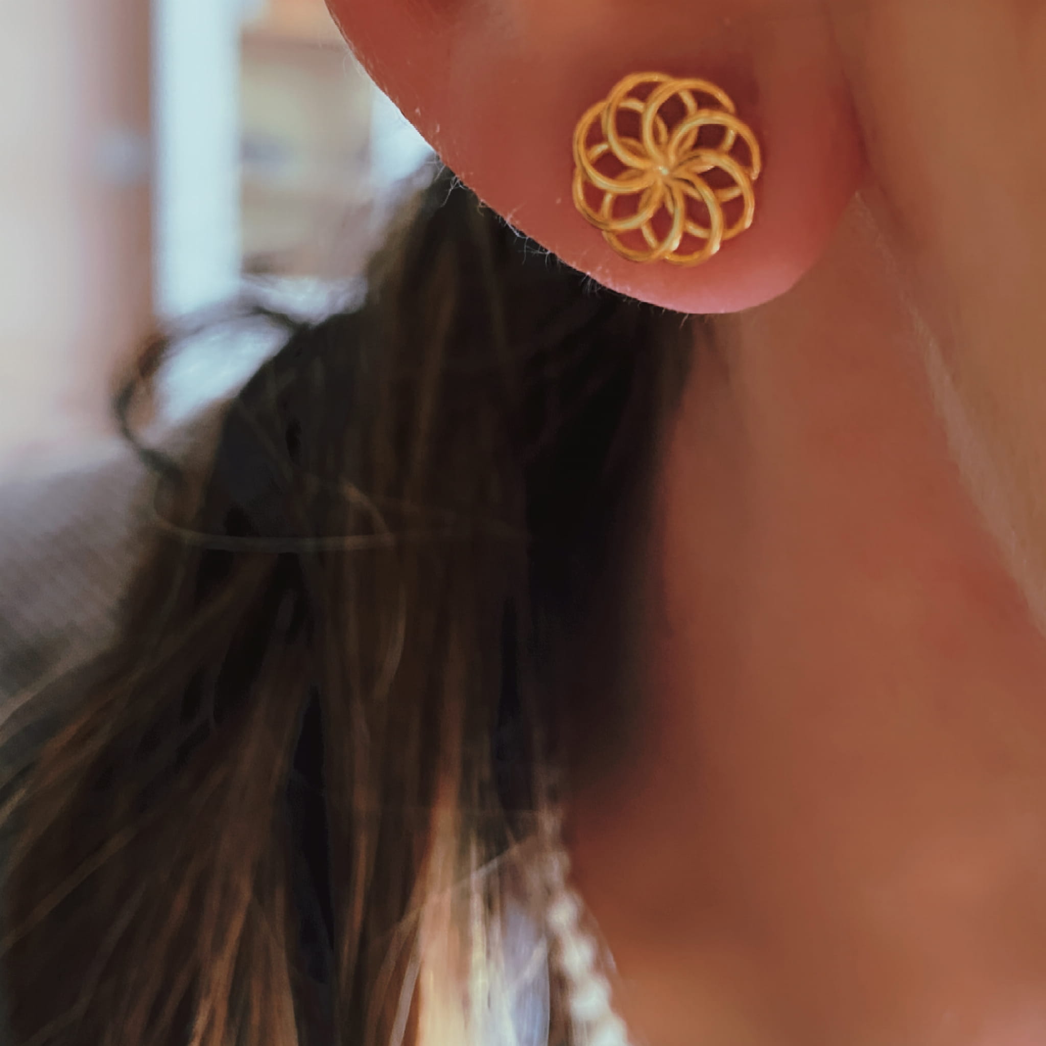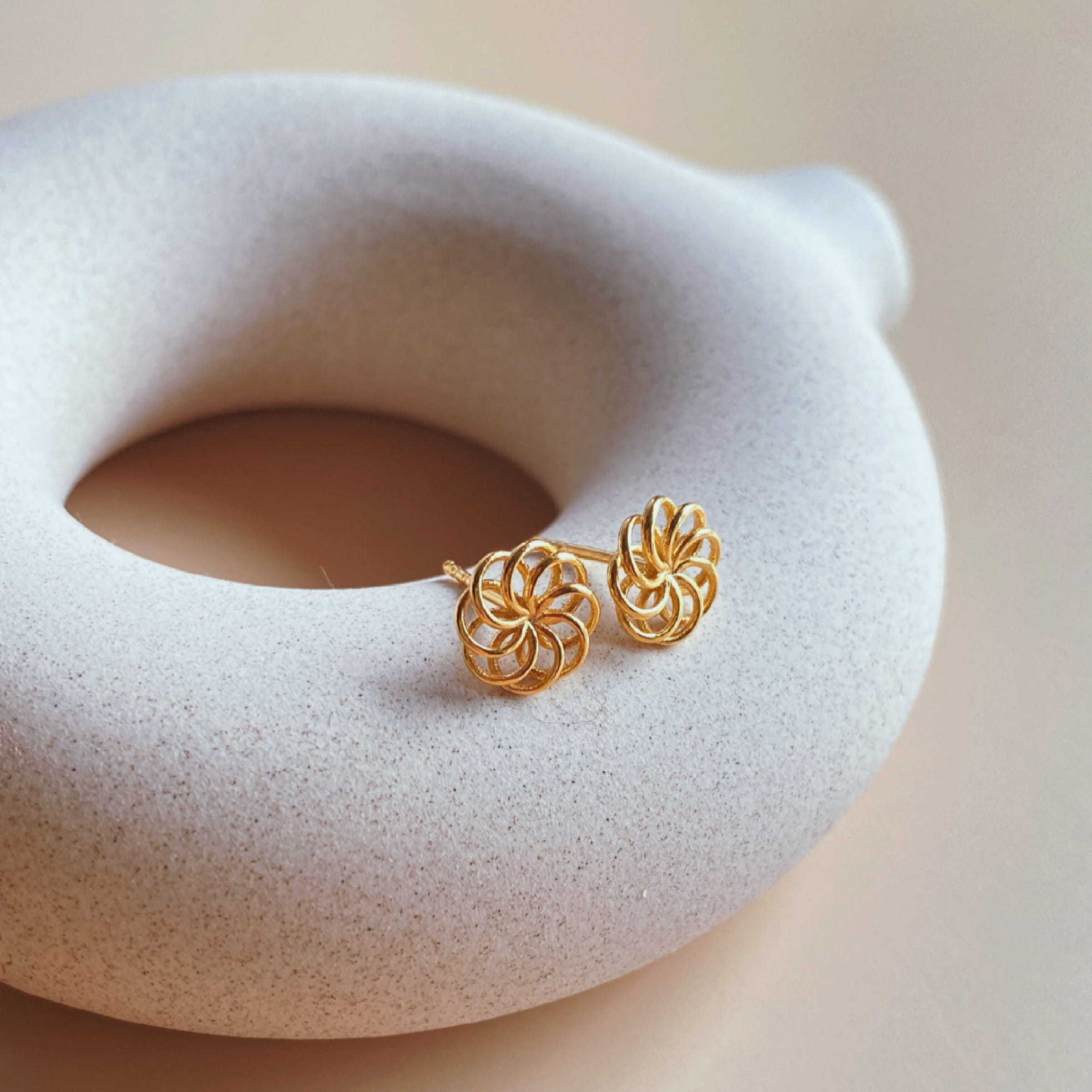 Kolczyki w formie ażurowego kwiatuszka pozłacane 24 karatowym złotem.