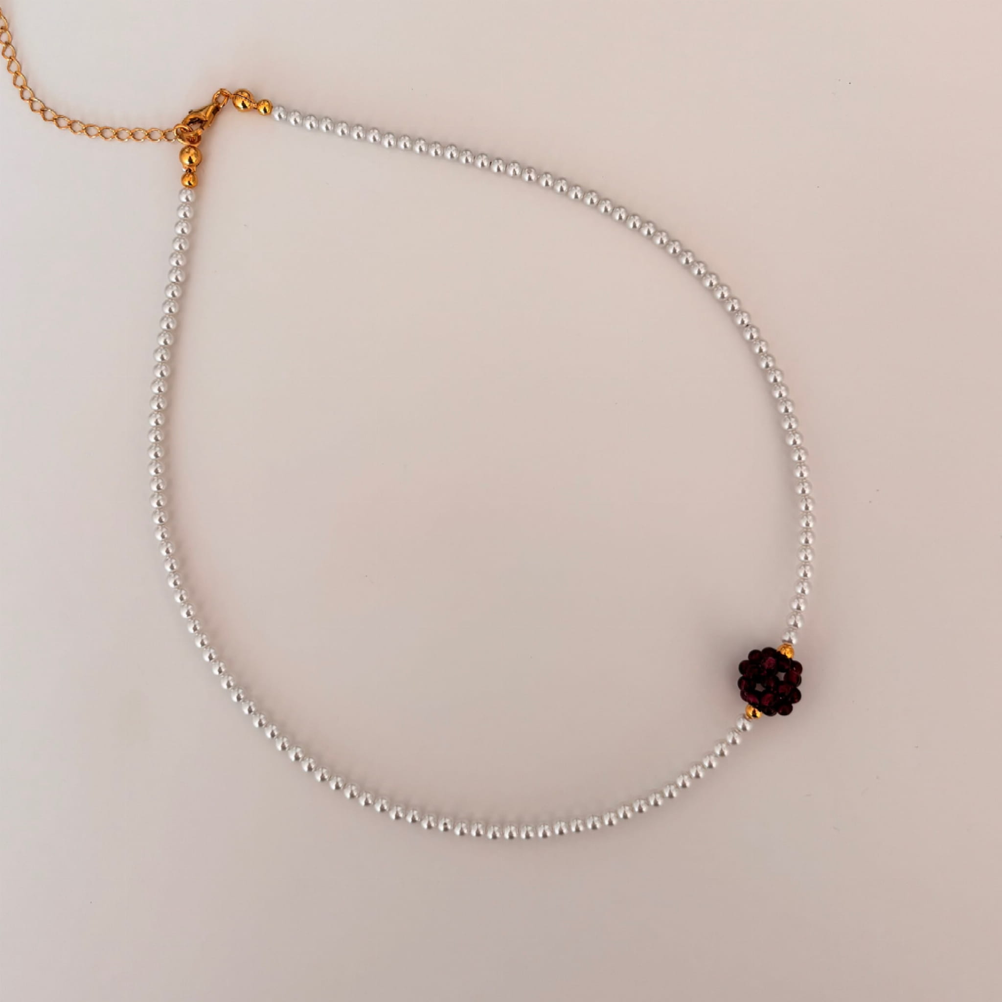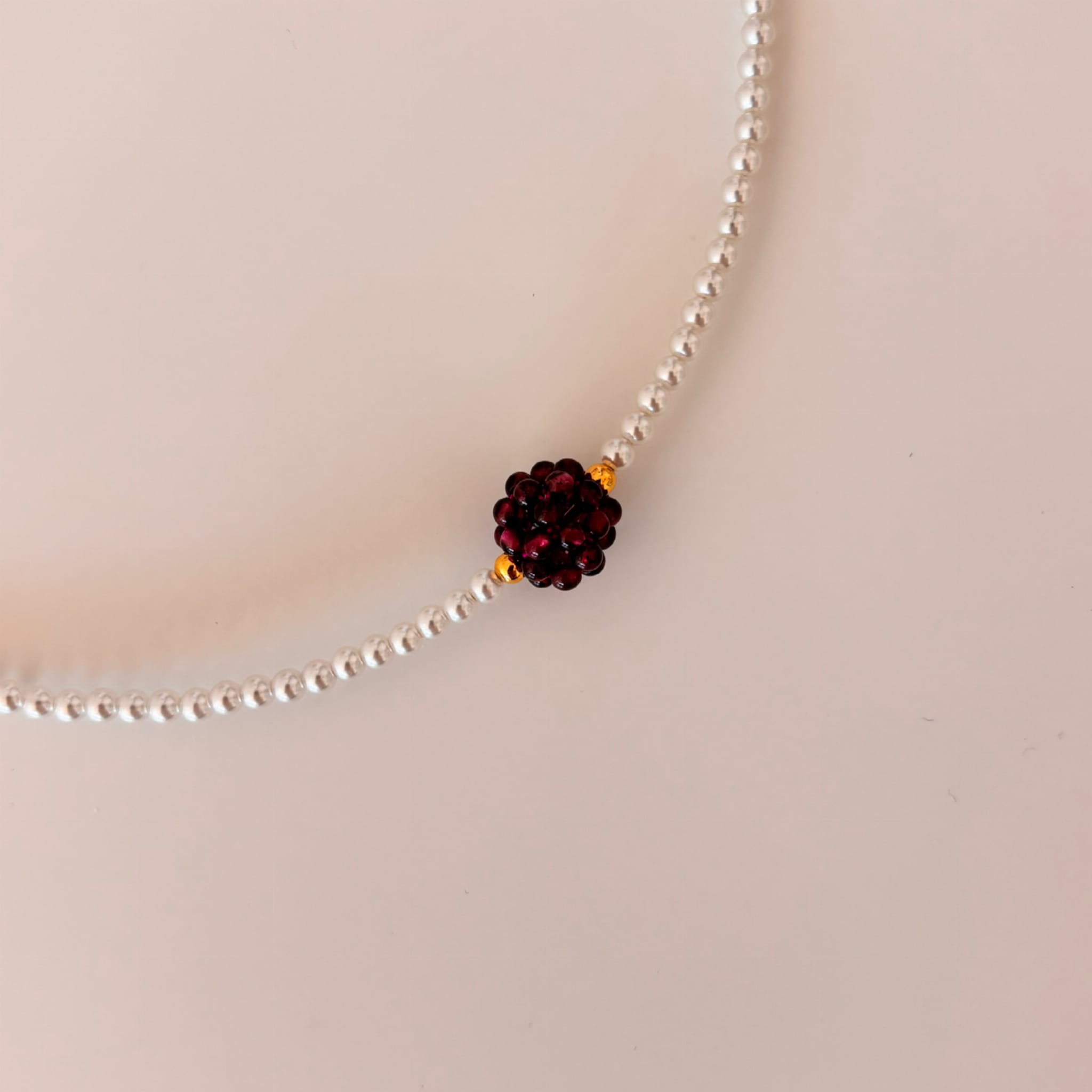 Minimalistyczny i niezwykle kobiecy naszyjnik z delikatnych białych perełek seashell, dodatkiem przekładki wykonanej z granatów o wyjątkowym bordowym kolorze.