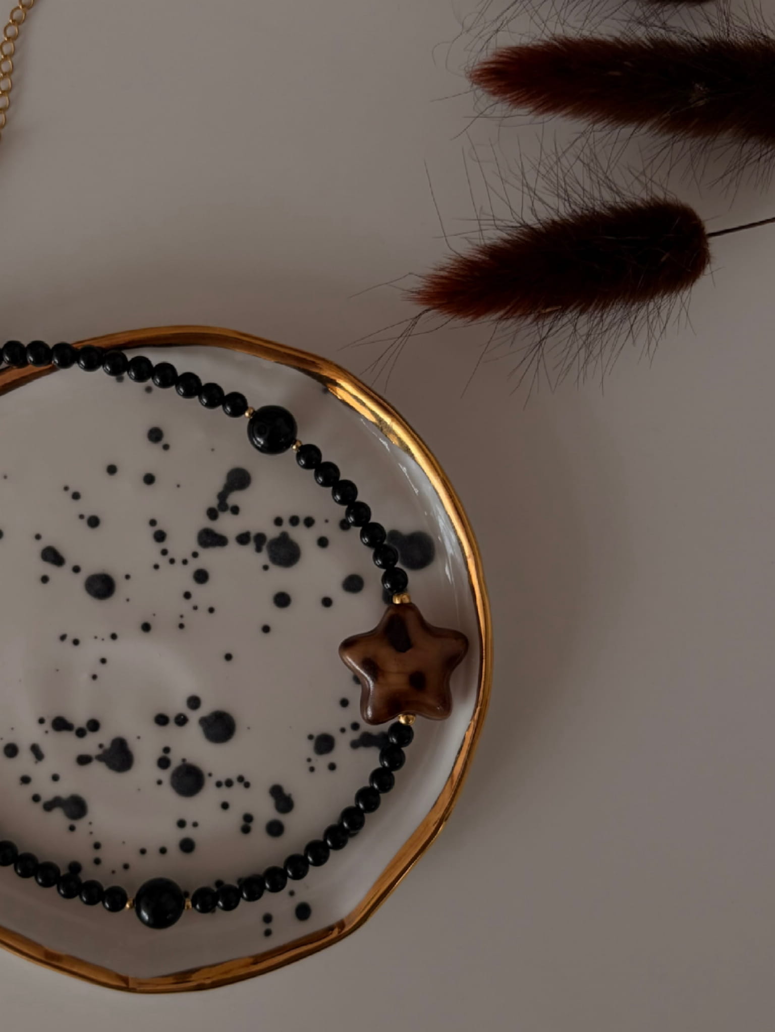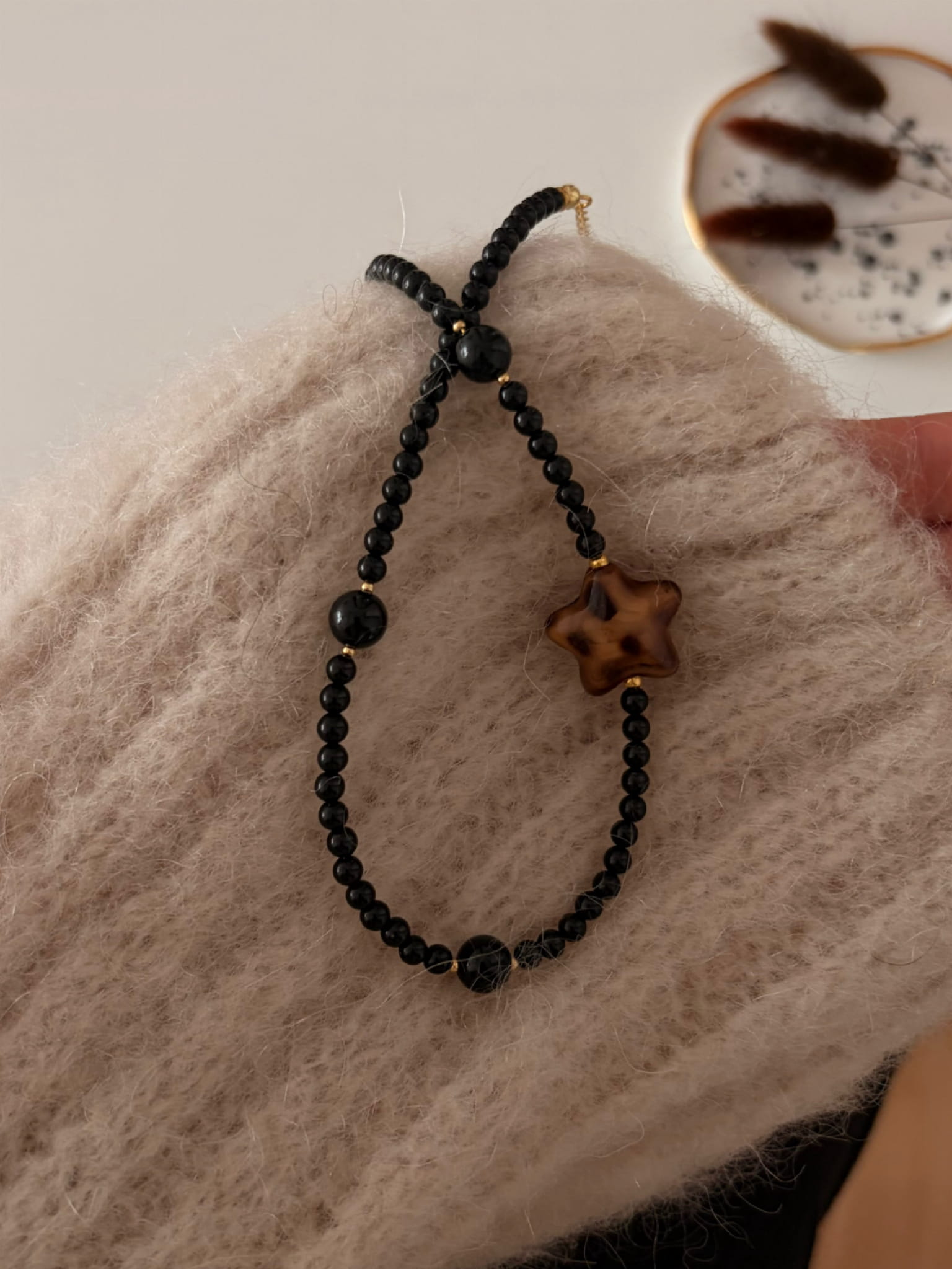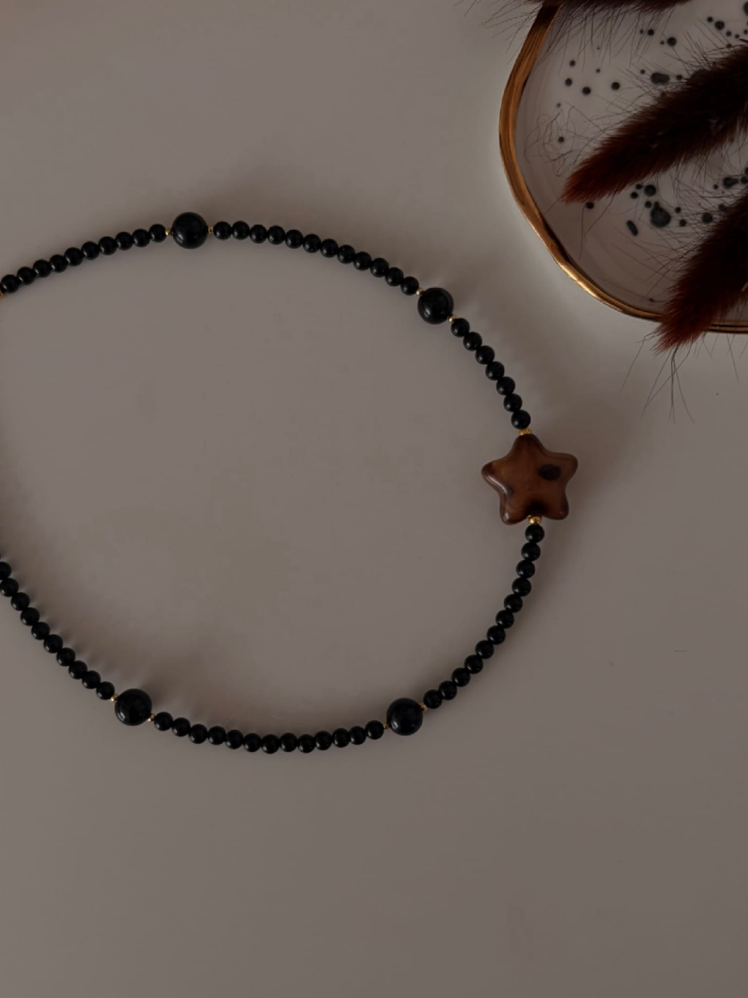 Minimalistyczny i uroczy naszyjnik z gwiazdką w plamki na bazie czarnego Onyksu w dwóch rozmiarach.