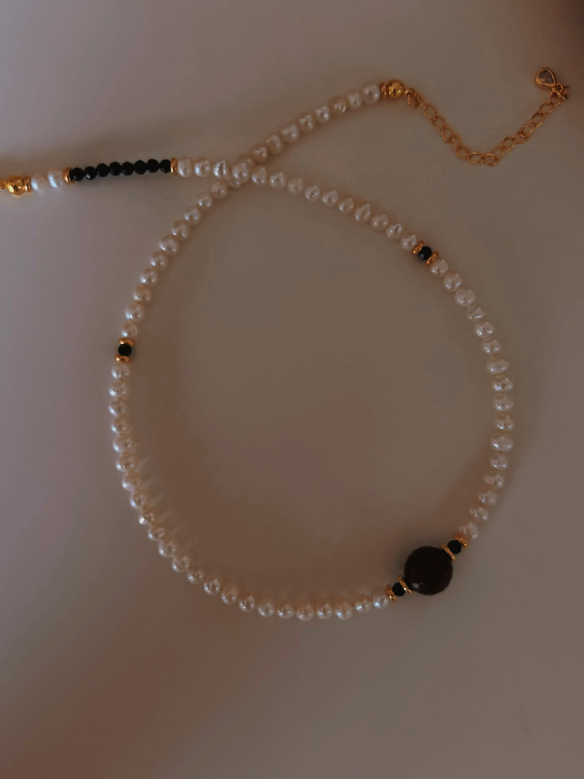 Minimalistyczny naszyjnik z pereł słodkowodnych z dodatkiem pozłacanych elementów oraz kamieni podkreślających kobiece piękno.