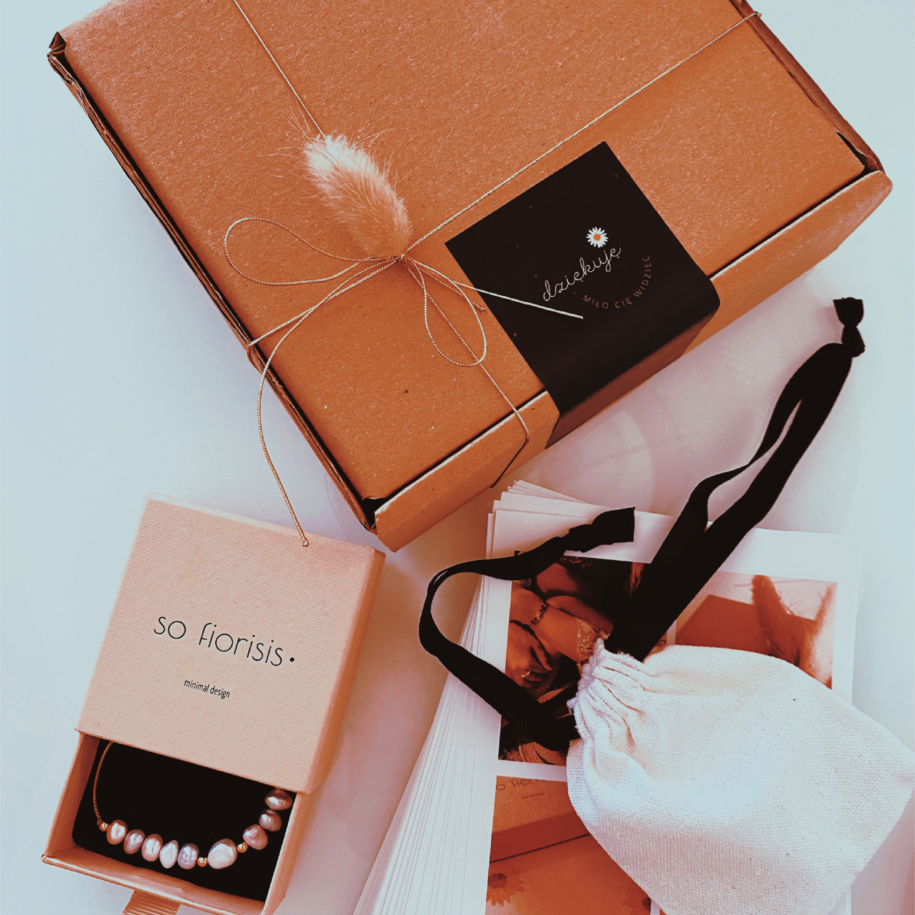 autorską ulotką, kwiatami suszonymi, woreczkiem do przechowywania biżuterii.
