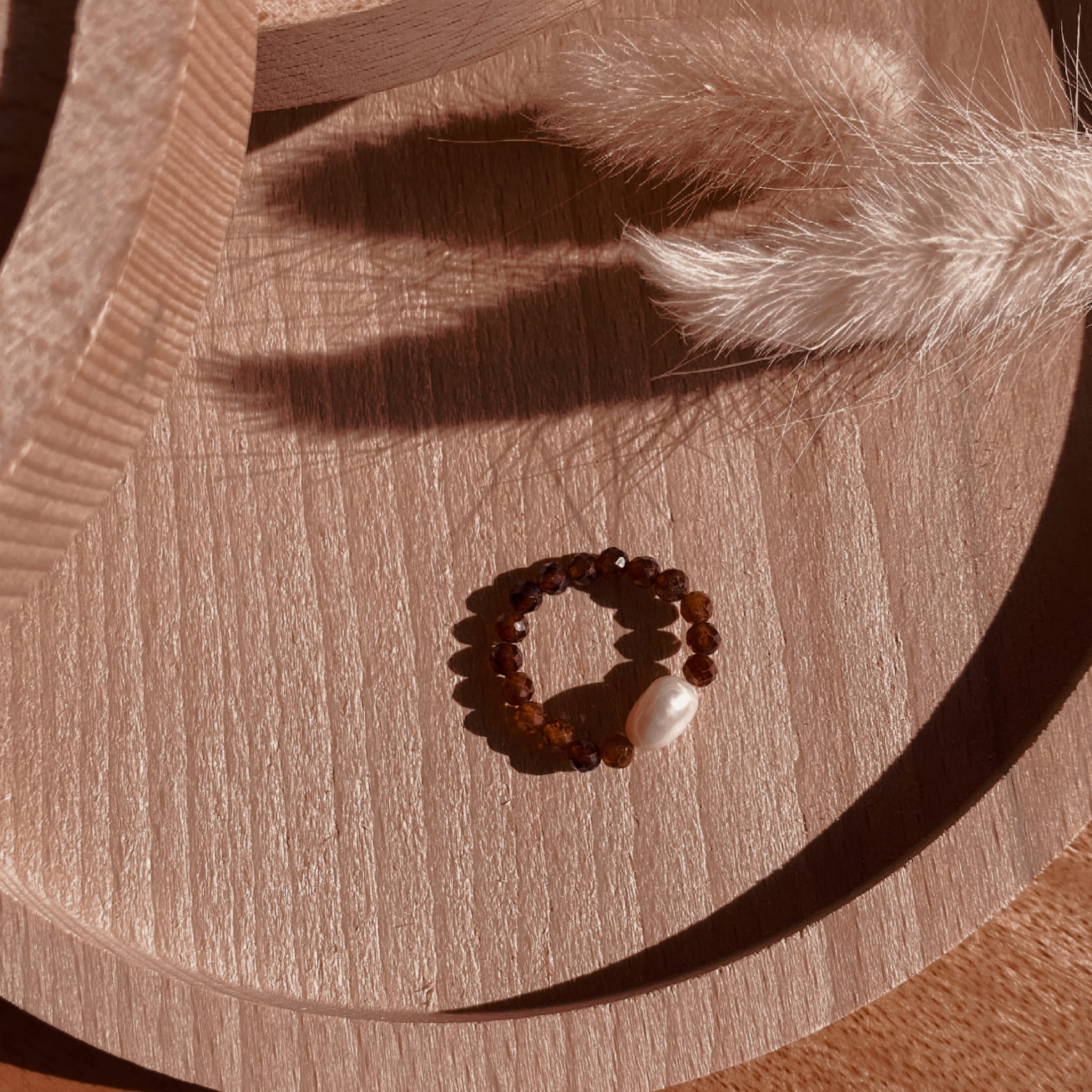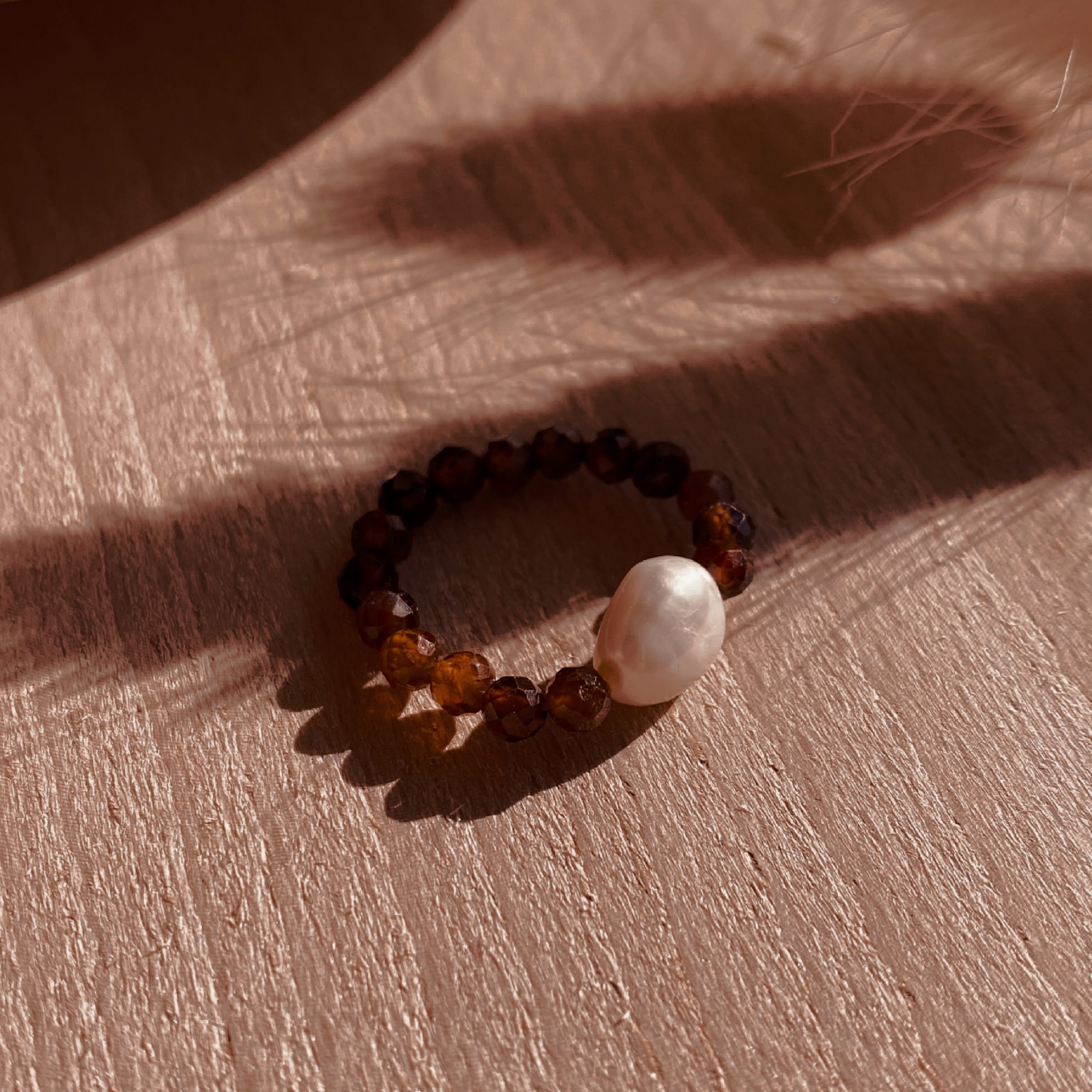 W centralnej części pierścionka znajduje się perła, która podkreśla brązowo- pomarańczowy odcień Karneolu.