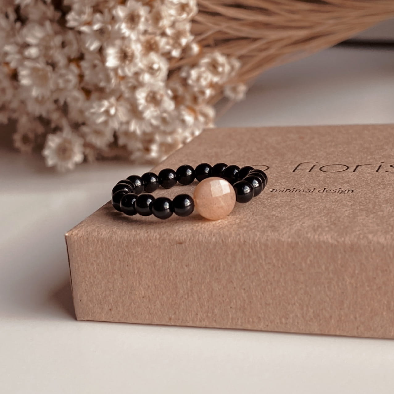 Czerń Onyksu idealnie podkreśla ciepło beżową barwę kamienia księżycowego.